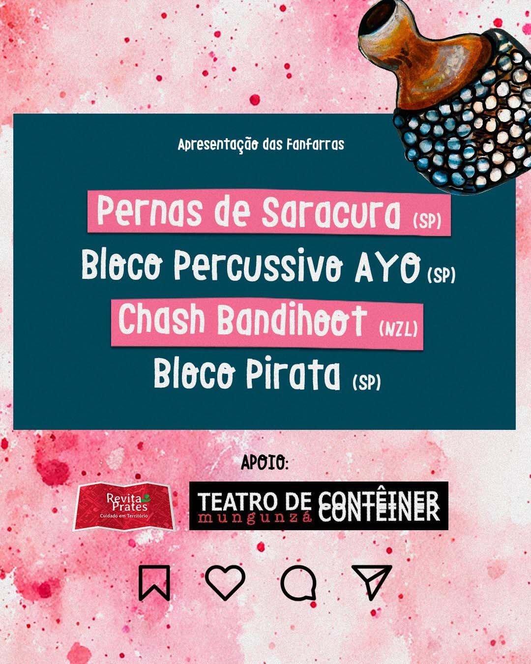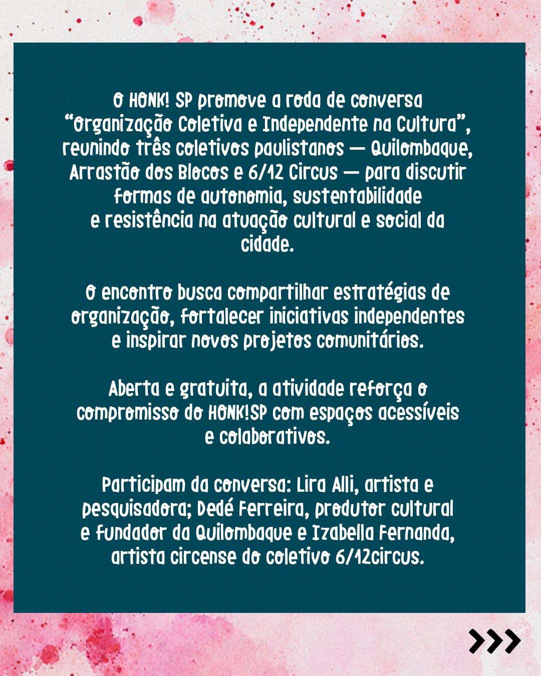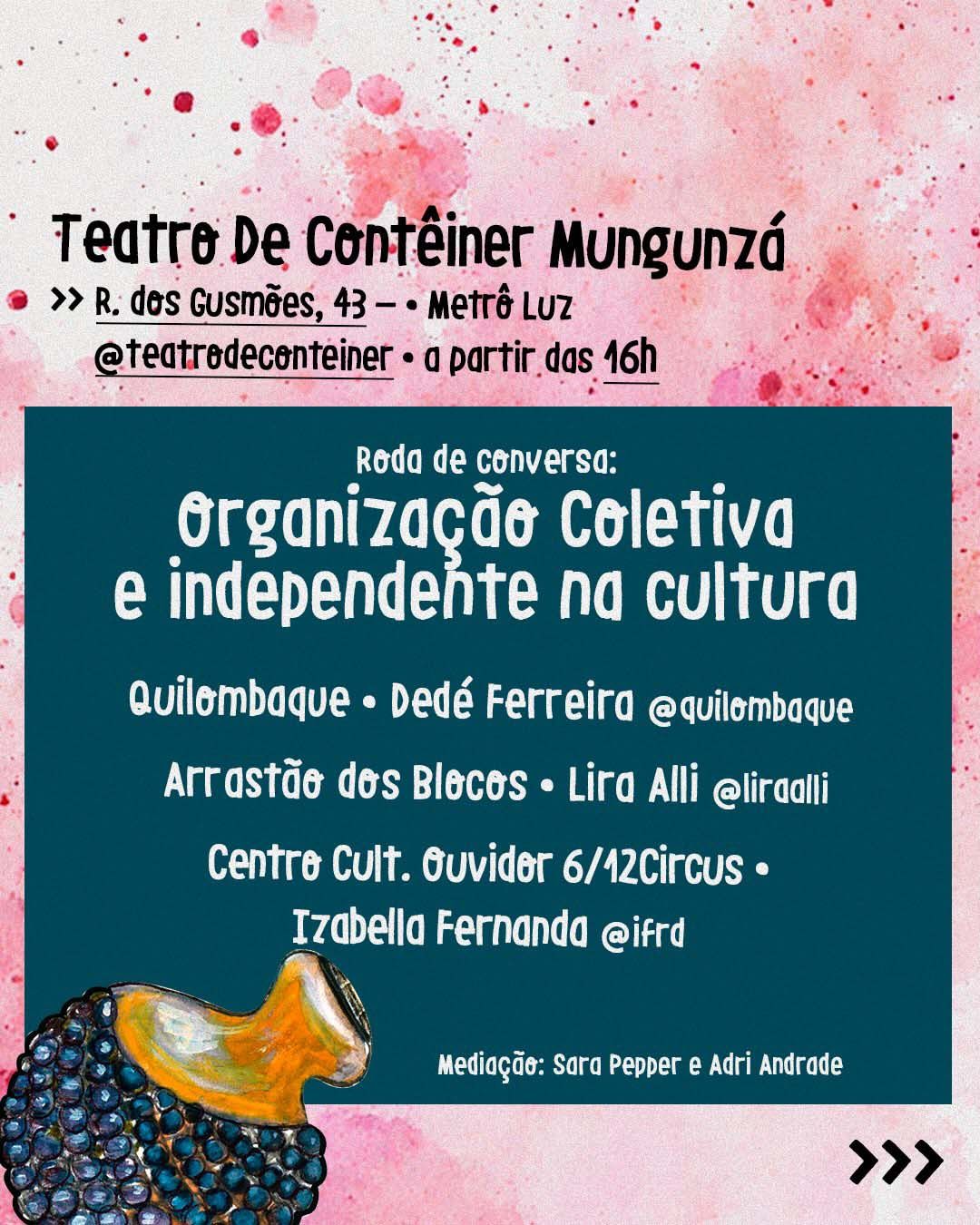 A partir das 16h, o festival aporta no Teatro de Contêiner com a roda de conversa “Organização Coletiva e Independente na Cultura”, reunindo três coletivos paulistanos — Quilombaque, Arrastão dos Blocos e 6/12 Circus — para trocar sobre autonomia, sustentabilidade e resistência nas práticas culturais da cidade.
