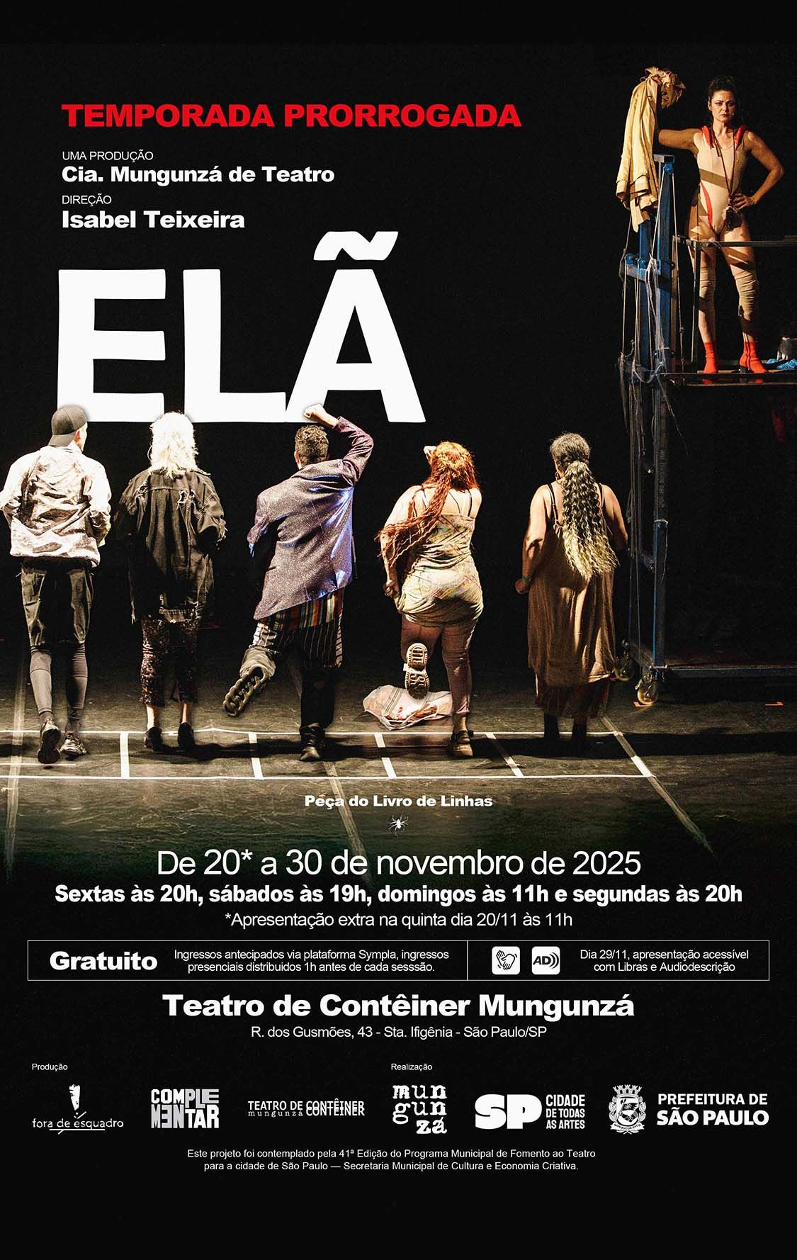 Devido ao grande sucesso, Elã da Cia. Mungunzá prorroga temporada. Dirigida por Isabel Teixeira, o espetáculo segue no Teatro de Contêiner, de 20 de novembro até 30 de novembro.