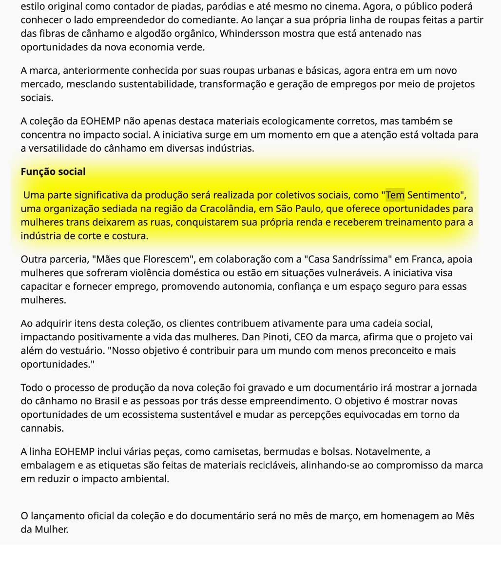 Pensando na questão social, uma parte significativa da produção será realizada por coletivos sociais, como "Tem Sentimento", uma organização sediada na região da Cracolândia, no Teatro de Contêiner, em São Paulo, que oferece oportunidades para mulheres trans deixarem as ruas, conquistarem sua própria renda e receberem treinamento para a indústria de corte e costura.